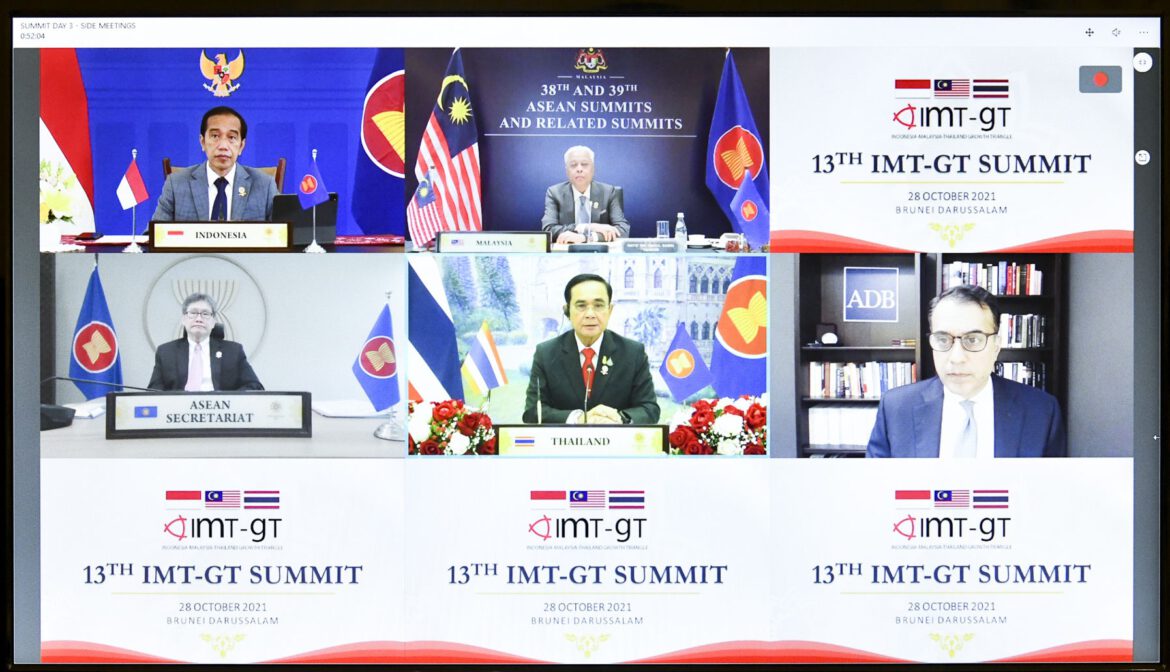 วันนี้ (28 ตุลาคม 2564) เวลา 10.15 น. ณ ตึกภักดีบดินทร์ ทำเนียบรัฐบาล พลเอก ประยุทธ์ จันทร์โอชา นายกรัฐมนตรีและรัฐมนตรีว่าการกระทรวงกลาโหม เข้าร่วมการประชุมระดับผู้นำแผนงานการพัฒนาเขตเศรษฐกิจสามฝ่าย อินโดนีเซีย-มาเลเซีย-ไทย ครั้งที่ 13 (IMT-GT Summit) ผ่านระบบการประชุมทางไกล โดยมี นายอิซมาอิล ซับรี ยักกบ นายกรัฐมนตรีมาเลเซีย นายโจโค วิโดโด ประธานาธิบดีอินโดนีเซีย นายดาโต๊ะ ปาดูกา ลิม จ๊อก ฮอย เลขาธิการอาเซียน และนายอาเหม็ด เอ็ม ซาอีด รองประธาน ADB เข้าร่วม โดยนายธนกร วังบุญคงชนะ โฆษกประจำสำนักนายกรัฐมนตรี กล่าวสรุปสาระสำคัญของการประชุม ดังนี้