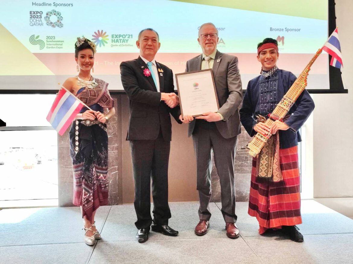 โดยในวันนี้ (8 มีนาคม 2565) AIPH ได้ประกาศการคัดเลือกอย่างเป็นทางการ ให้ประเทศไทยเป็นเจ้าภาพการจัดงานมหกรรมพืชสวนโลกจังหวัดอุดรธานี พ.ศ. 2569 (ระดับ B) ณ Crowne Plaza Dubai Marina เมืองดูไบ สหรัฐอาหรับเอมิเรตส์ ภายใต้แนวคิด Diversity of Life: Connecting people, water and plants for sustainable living (วิถีชีวิตสายน้ำและพืชพรรณ) ระยะเวลาจัดงานระหว่างวันที่ 1 พฤศจิกายน 2569 – 14 มีนาคม 2570 (134 วัน) บริเวณพื้นที่ชุ่มน้ำหนองแด ตำบลกุดสระ อำเภอเมือง จังหวัดอุดรธานี บนเนื้อที่ 1,030 ไร่ แบ่งเป็น พื้นน้ำ 400 ไร่ และพื้นดิน 630 ไร่ คาดว่าจะทำให้มีจำนวนผู้เข้าชมงานถึง 3.6 ล้านคน เป็นชาวไทยร้อยละ 70 และชาวต่างชาติร้อยละ 30 มีจำนวนประเทศที่เข้าร่วมงานไม่น้อยกว่า 20 ประเทศ / องค์กร / สมาคม