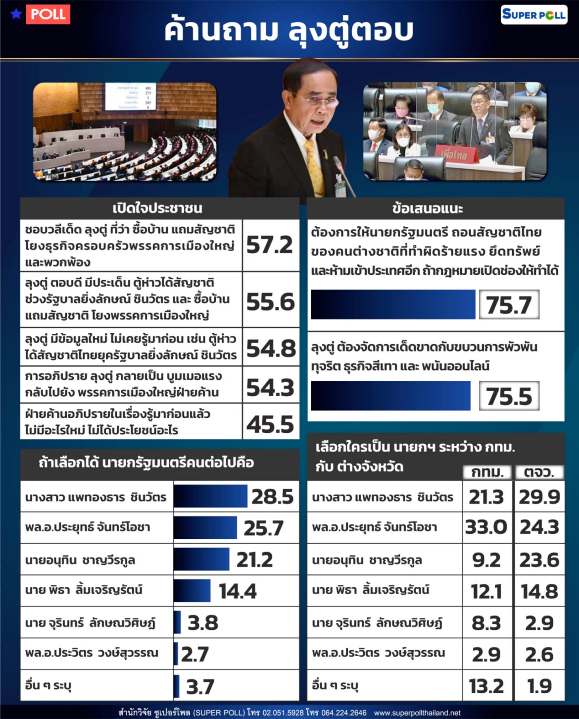ซูเปอร์โพลเสนอผลสำรวจเรื่องการอภิปรายนายกรัฐมนตรี กรณีตู้ห่าว และทุนจีนสีเทา พบว่าส่วนใหญ่ หรือร้อยละ 57.2 ระบุชอบวลีเด็ดของ พล.อ.ประยุทธ์ จันทร์โอชา นายกรัฐมนตรี ที่บอกว่า ซื้อบ้านแถมสัญชาติ เชื่อมโยงกับ ธุรกิจครอบครัวพรรคการเมืองใหญ่ และพวกพ้อง, ร้อยละ 55.6 ระบุ พล.อ.ประยุทธ์ จันทร์โอชา นายกรัฐมนตรี ตอบโต้ได้ดี มีประเด็น, ร้อยละ 54.8 ระบุ พล.อ.ประยุทธ์ จันทร์โอชา นายกรัฐมนตรี ตอบโต้ด้วยข้อมูลใหม่ ไม่เคยรู้มาก่อน เช่น ตู้ห่าวได้สัญชาติไทยในยุครัฐบาลยิ่งลักษณ์ ชินวัตร, ร้อยละ 54.3 ระบุการอภิปรายนายกรัฐมนตรี กลายเป็นบูมเมอแรงกลับไปยังพรรคการเมืองใหญ่ฝ่ายค้าน และร้อยละ 45.5 ระบุฝ่ายค้านอภิปรายในเรื่องรู้มาก่อนแล้ว ไม่มีอะไรใหม่