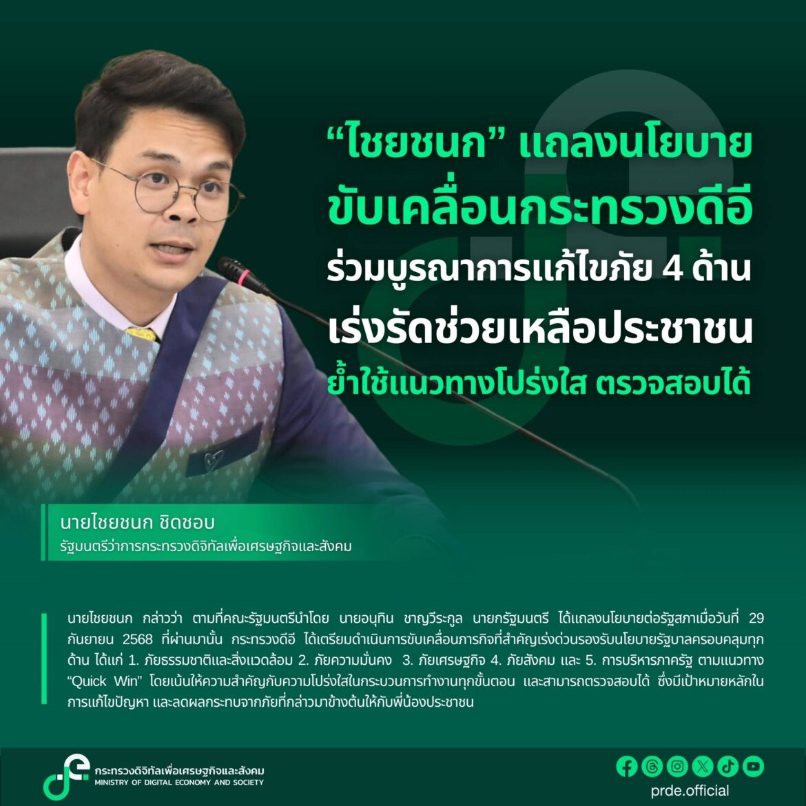 6 ตุลาคม 2568 นายไชยชนก ชิดชอบ รัฐมนตรีว่าการกระทรวงดิจิทัลเพื่อเศรษฐกิจและสังคม (ดีอี) เป็นประธานการแถลงนโยบายขับเคลื่อนกระทรวงดิจิทัลเพื่อเศรษฐกิจและสังคม โดยมีนายพชร อนันตศิลป์ ปลัดกระทรวงดีอี พร้อมด้วยคณะผู้บริหาร และหัวหน้าหน่วยงานในสังกัดกระทรวงดิจิทัล เข้าร่วม ณ ห้องประชุม 203 ชั้น 2 อาคารกระทรวงดิจิทัลเพื่อเศรษฐกิจและสังคม (แห่งใหม่) ศูนย์ราชการฯ อาคาร ซี ถ.แจ้งวัฒนะ หลักสี่ กรุงเทพฯ