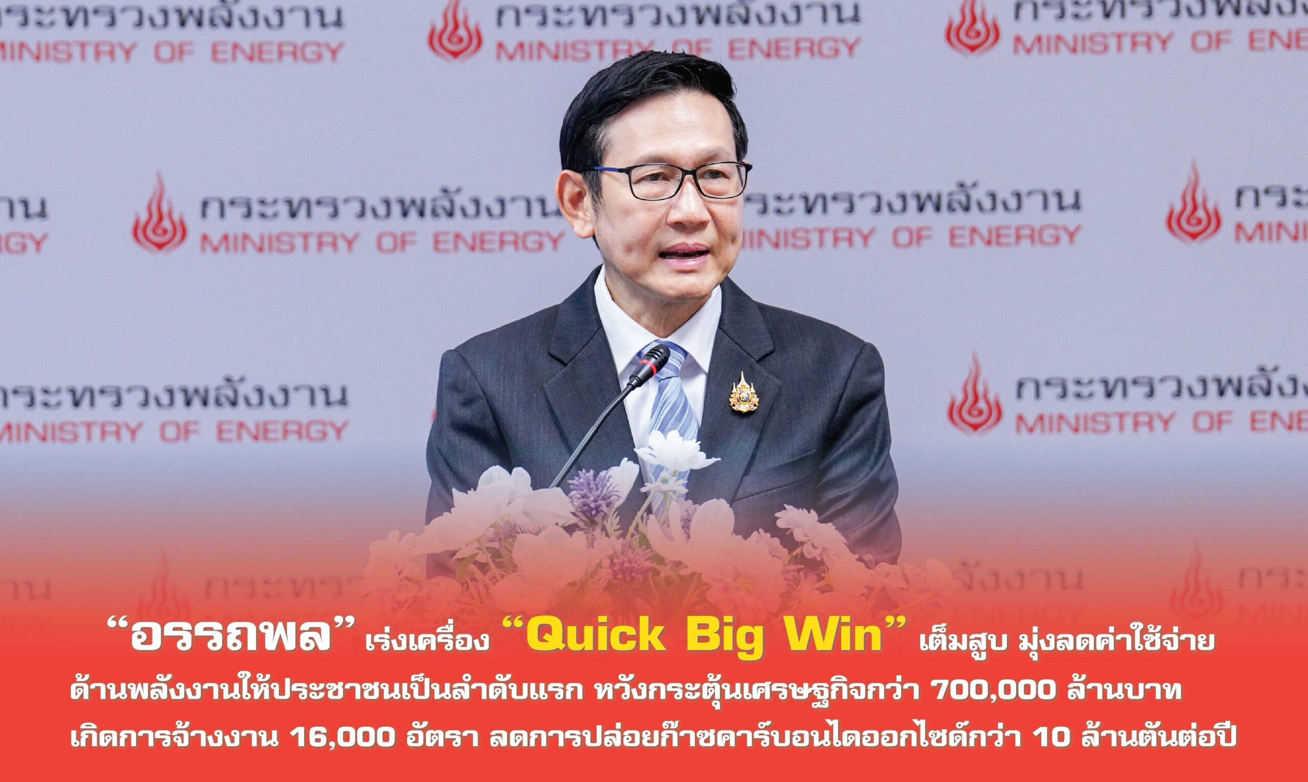 นายอรรถพล ฤกษ์พิบูลย์ รัฐมนตรีว่าการกระทรวงพลังงาน พร้อมด้วยผู้บริหารระดับสูง เปิดกระทรวงพลังงานแถลงนโยบายสำคัญที่ต้องเร่งผลักดันให้สอดคล้องกับนโยบายรัฐบาล ทั้งด้านเศรษฐกิจ การส่งเสริมการลงทุน การผลักดันสังคมคาร์บอนต่ำ และการส่งเสริมบทบาทภาคเอกชนในการลงทุนพัฒนาโครงสร้างพื้นฐานของประเทศ ซึ่งในส่วนของกระทรวงพลังงาน ได้ผลักดันโครงการ “Quick Big Win” ด้านพลังงาน