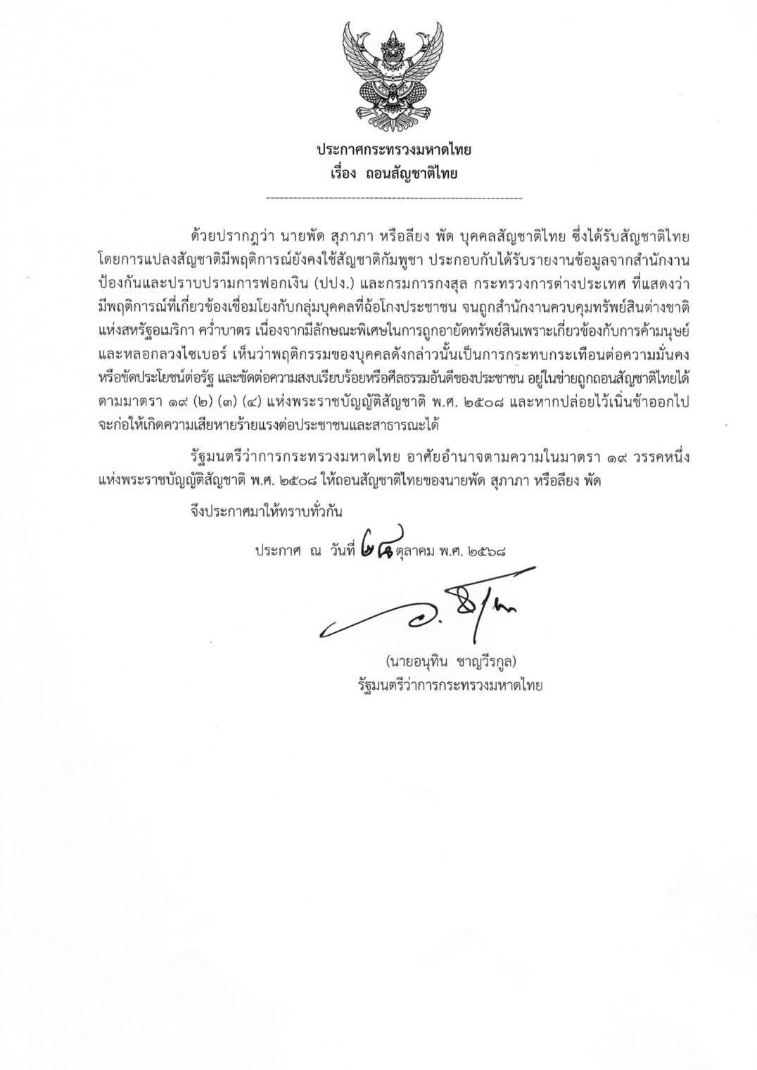 นายสิริพงศ์ อังคสกุลเกียรติ โฆษกประจำสำนักนายกรัฐมนตรี เปิดเผยว่า วันนี้นายอนุทิน ชาญวีรกูล นายกรัฐมนตรีและรัฐมนตรีว่าการกระทรวงมหาดไทย ได้ลงนามในประกาศกระทรวงมหาดไทย เรื่อง ถอนสัญชาติ นายพัด สุภาภา หรือลียง พัด ซึ่งบุคคลดังกล่าว ได้รับสัญชาติไทย โดยการแปลงสัญชาติ แต่ยังมีพฤติการณ์ใช้สัญชาติกัมพูชา อีกทั้งมีรายงานข้อมูลจากสำนักงาน ปปง. และกรมการกงสุล กระทรวงการต่างประเทศว่า บุคคลข้างต้น มีพฤติการณ์ที่เกี่ยวข้องเชื่อมโยงกับกลุ่มบุคคลที่ฉ้อโกงประชาชน จนถูกสำนักงานควบคุมทรัพย์สินต่างชาติแห่งสหรัฐอเมริกา ดำเนินการคว่ำบาตรแล้ว เนื่องจากมีลักษณะพิเศษในการถูกอายัดทรัพย์สินเพราะเกี่ยวข้องกับการค้ามนุษย์ หลอกลวงไซเบอร์
