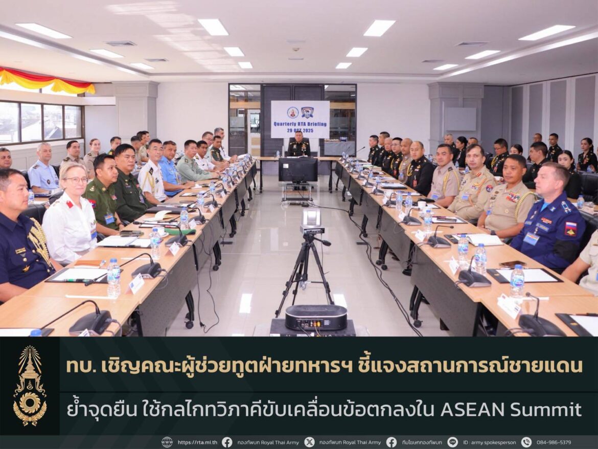 29 ตุลาคม 2568 ทบ. เชิญคณะผู้ช่วยทูตฝ่ายทหารฯ ชี้แจงสร้างความเข้าใจสถานการณ์ชายแดน ย้ำจุดยืนการแก้ไขปัญหาอาชญากรรมข้ามชาติ พร้อมใช้กลไกทวิภาคีขับเคลื่อนข้อตกลงตามปฏิญญาร่วมใน ASEAN Summit สร้างสันติภาพชายแดน