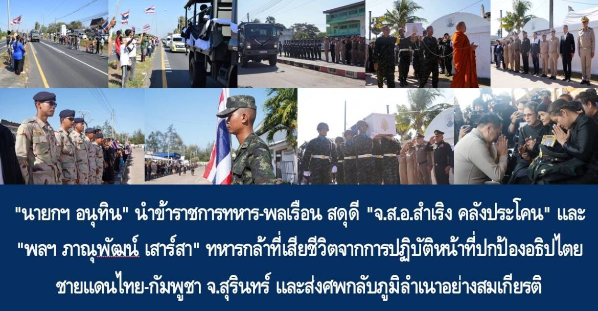 21 ธันวาคม 2568 “นายกฯ อนุทิน” นำข้าราชการทหาร-พลเรือน สดุดี “จ.ส.อ.สำเริง คลังประโคน” และ “พลฯ ภาณุพัฒน์ เสาร์สา” ทหารกล้าที่เสียชีวิตจากการปฏิบัติหน้าที่ปกป้องอธิปไตยชายแดนไทย-กัมพูชา จ.สุรินทร์ และส่งศพกลับภูมิลำเนาอย่างสมเกียรติ