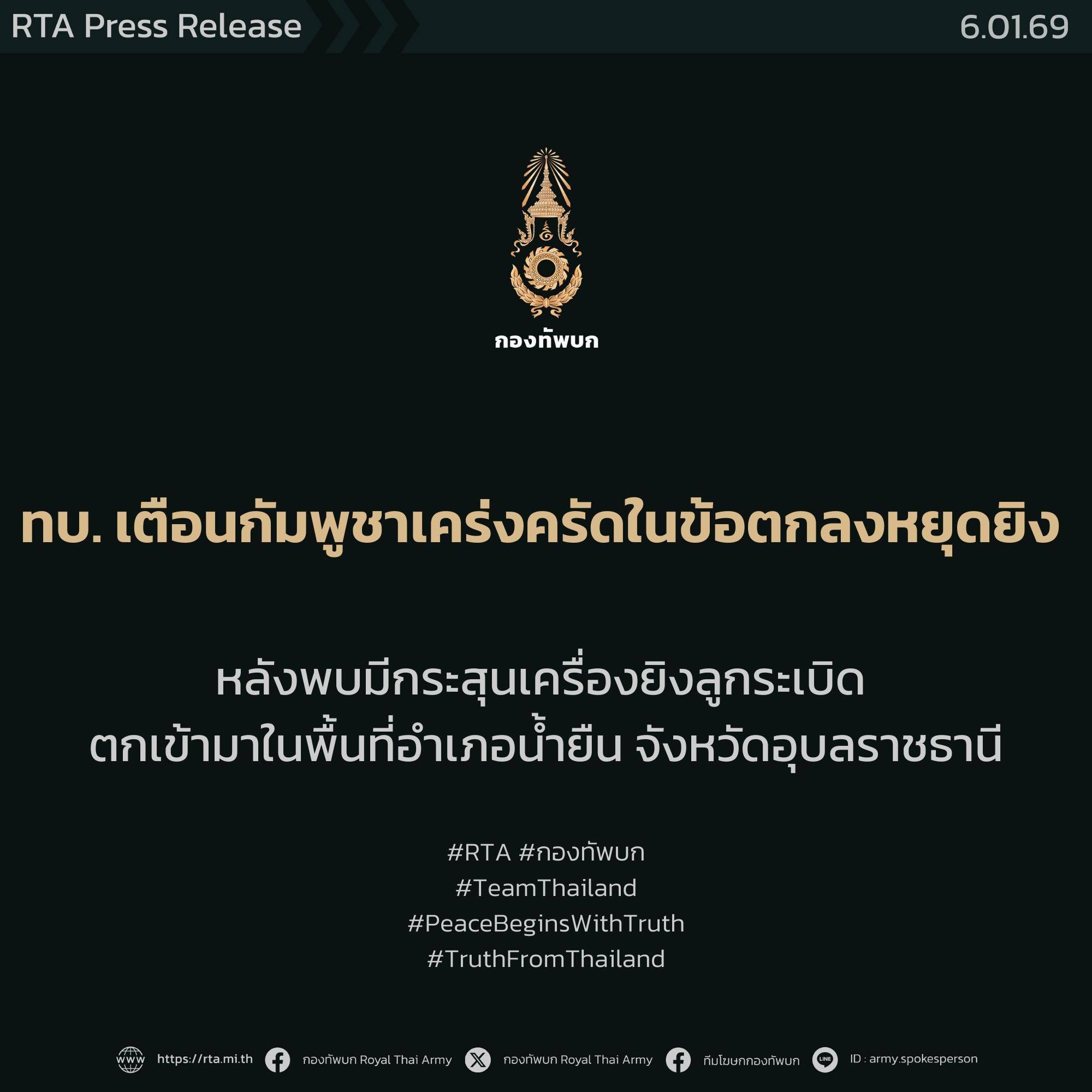 วันนี้ (6 มกราคม 2569) พลตรี วินธัย สุวารี โฆษกกองทัพบกเผยว่า เมื่อเวลา 07.40 น. ได้รับรายงานจากกองกำลังสุรนารี กองทัพภาคที่ 2 ได้ยินเสียงอาวุธไม่ทราบชนิดจากฝ่ายกัมพูชา จำนวน 1 นัด ยิงเข้ามาในเขตไทยบริเวณเนิน 469 อำเภอน้ำยืน จังหวัดอุบลราชธานี จากการตรวจสอบเพิ่มเติมพบว่าเป็นการยิงเครื่องยิงลูกระเบิดมาจากฝั่งกัมพูชา ส่งผลให้กำลังพลได้รับบาดเจ็บเล็กน้อยจากสะเก็ดระเบิด 1 นาย