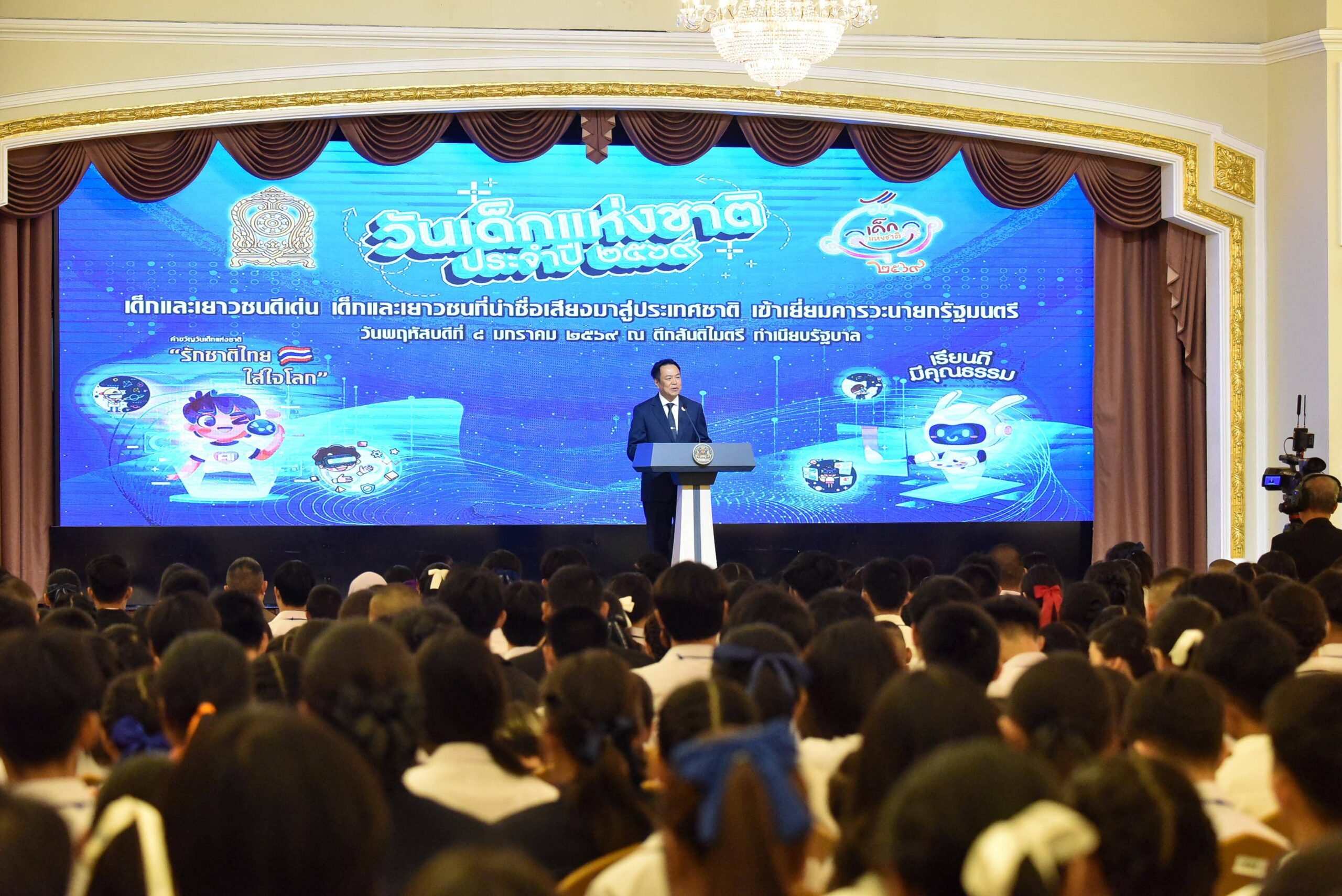 นายกรัฐมนตรีกล่าวถึงกิจกรรมในวันเด็กแห่งชาติ ที่เด็กและเยาวชนจะได้มีโอกาสเยี่ยมชมสถานที่ราชการและหน่วยงานต่าง ๆ เพื่อสร้างแรงบันดาลใจและความภาคภูมิใจในความเป็นไทย รวมถึงขอให้เด็กและเยาวชนทุกคนมีความภาคภูมิใจในประเทศชาติ และเติบโตขึ้นเป็นพลังสำคัญในการร่วมกันพัฒนาประเทศไทยให้มั่นคง มั่งคั่ง และยั่งยืนต่อไป ในโอกาสนี้นายกรัฐมนตรียังฝากข้อคิดสำคัญว่า “เชื่อว่าทุกคนเป็นคนดีอยู่แล้ว แต่สิ่งสำคัญคือความกล้าหาญ ทั้งกล้าทำในสิ่งที่ถูกต้อง และกล้าลองทำสิ่งใหม่ ๆ เน้นการพัฒนาความสามารถอย่างรอบด้าน ทั้งวิชาการ กีฬา ศิลปะ และภาษาต่างประเทศ การพัฒนาตนเองไม่สามารถทำคนเดียวได้ แต่ต้องทำเป็นทีม “ทีมไทยแลนด์ไม่มีวันตาย”” พร้อมขอให้ทุกคนขยันตั้งใจรับช่วงต่อในการสร้างประเทศไทยให้เข้มแข็งและเจริญก้าวหน้า นอกจากนี้ นายกรัฐมนตรียังย้ำถึงความสำคัญของกีฬาและการเคารพกติกา การเล่นกีฬาไม่จำเป็นต้องเป็นเลิศหรือแชมป์ แต่เพื่อสร้างร่างกายที่แข็งแรง ฝึกความอดทน และเรียนรู้การทำงานเป็นทีม รวมถึงการมีน้ำใจนักกีฬาและเคารพคู่แข่งขัน เพื่อให้สังคมมีความสุขและเกิดความสามัคคี