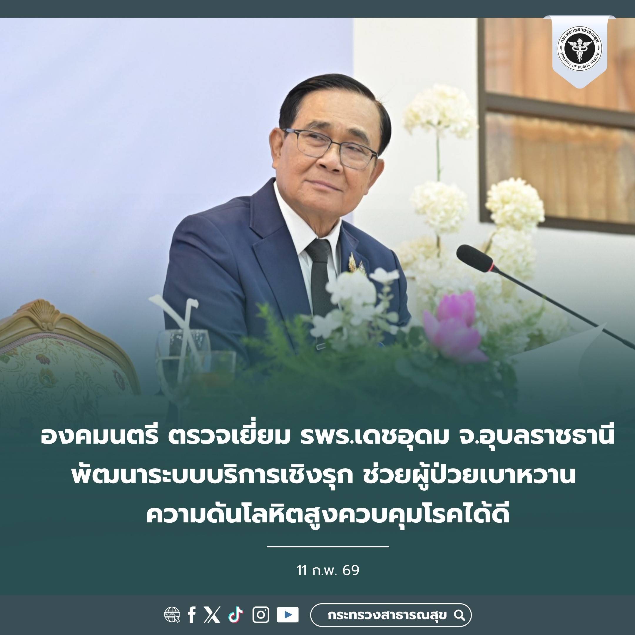 ไฮไลท์การเมือง 12 กุมภาพันธ์ 2569 องคมนตรี ตรวจเยี่ยมการดำเนินงานโรงพยาบาลสมเด็จพระยุพราชเดชอุดม จังหวัดอุบลราชธานี พัฒนาตามแนวทาง “โรงพยาบาลต้นแบบแห่งความสุข” จัดระบบบริการเชิงรุกและบูรณาการเครือข่าย ร่วมกับการใช้เทคโนโลยีดิจิทัลดูแลผู้ป่วยโรคไม่ติดต่อเรื้อรัง ช่วยผู้ป่วยเบาหวาน ความดันโลหิตสูง ควบคุมโรคได้ดี ได้รับการคัดกรองความเสี่ยงอย่างครอบคลุม พร้อมพัฒนาระบบสนับสนุนบริการอัจฉริยะ (Smart-ERP) เพิ่มประสิทธิภาพการบริหารจัดการองค์กรและการจัดระบบบริการสุขภาพ